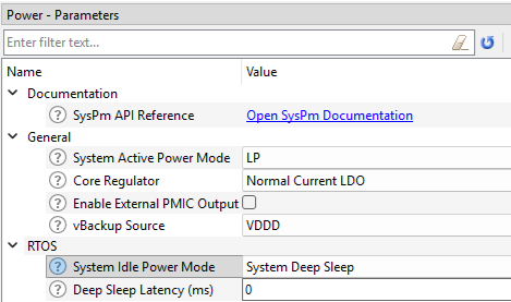 The System Idle Power Mode setting ends up in the modus.design file srss[0].power[0], Personality block. The param...hold on, that's where the name comes from! Anyway, the idlePwrMode parameter is set to what becomes the define CY_CFG_PWR_MODE_DEEPSLEEP, and when compiled, file sysfg_system.h is created and gets CY_CFG_PWR_SYS_IDLE_MODE set to CY_CFG_PWR_MODE_DEEPSLEEP. A note on configUSE_TICKLESS_IDLE; it's set to 2. The FreeRTOS docs say setting it to 2 allows user defined functionality in any FreeRTOS port, but I could not find anywhere a value of 2 is used. Non-zero values are used to enable things like a weak implementation of vApplicationSleep() and the call logic in tasks.c. So I'm saying a value of 1 would work for the Infineon FreeRTOS port.