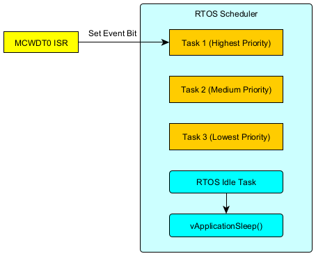 Here's an diagram showing a pre-emptive RTOS scheduler with 3 user tasks with different priorities and the FreeRTOS Idle Task that runs when all of the user tasks are in the blocking state. Let's just say for the sake of argument that the whole shoot'n match starts off from a MCWDT0 timer ISR that sets the event bit for Task 1. Tasks 1 and 2 do all the real work of the system and the job of Task 3 is to check system status and keep running if the system should stay awake or block if it can go to sleep. When Task 3 blocks there's going to be a period of time when all user tasks are now blocking - the period of time until a MCWDT0 timer interrupt; MCWDT0 being a timer that can run from a clock that remains active in Deep Sleep. So the next task that will run is the idle task that immediately calls vApplicationSleep(). No! In tasks.c, you'll find the idle task only calls vApplicationSleep() if the expected idle time (the time until a task is expected to run), is greater than define configEXPECTED_IDLE_TIME_BEFORE_SLEEP. This value defaults to 2 in FreeRTOS.h, but can be overridden by setting the Deep Sleep Latency in Device Configurator, which allows a value of 1, and the FreeRtosConfig.h template will happily set configEXPECTED_IDLE_TIME_BEFORE_SLEEP to that value, which will then throw an error because FreeRTOS requires a value of at least 2. Now I found where configEXPECTED_IDLE_TIME_BEFORE_SLEEP is checked, but not where it is used, but the internet says there could be a timer underflow if set less than 2, or the overhead of sleeping/waking for short periods could end up increasing power consumption. Since I'm setting CY_CFG_PWR_DEEPSLEEP_LATENCY to 0, I get the default value and all is right with the world.